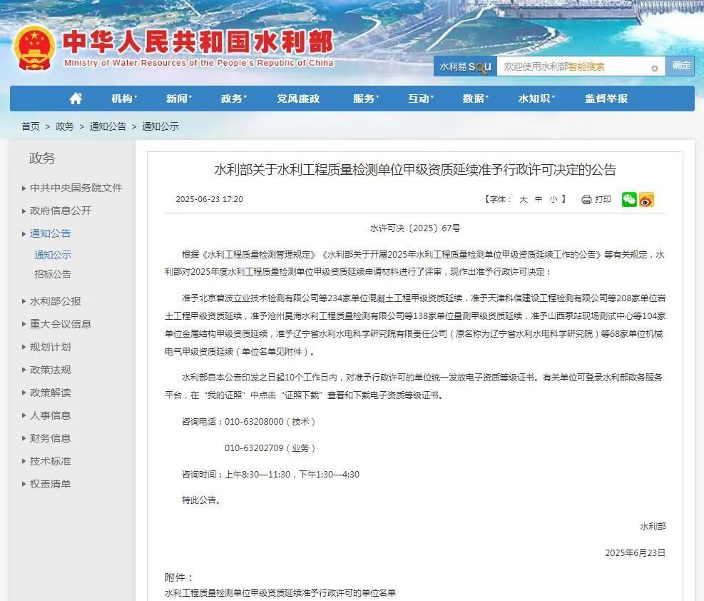6月23日,水利部发布《关于水利工程质量检测单位甲级资质延续准予行政许可决定的公告》,广东建科院(300675)所属源胜公司再次成功获得水利工程质量检测岩土工程、混凝土工程、金属结构、机械电气、量测五个专业甲级资质证书。这是自2019年首次全面揽获水利工程质量检测单位五项甲级资质以来,源胜公司持续深耕水利检测领域,凭借扎实的技术基础、严谨的检测流程以及高质量的服务成果,再次获得全项达标,顺利通过水利部权威认证。